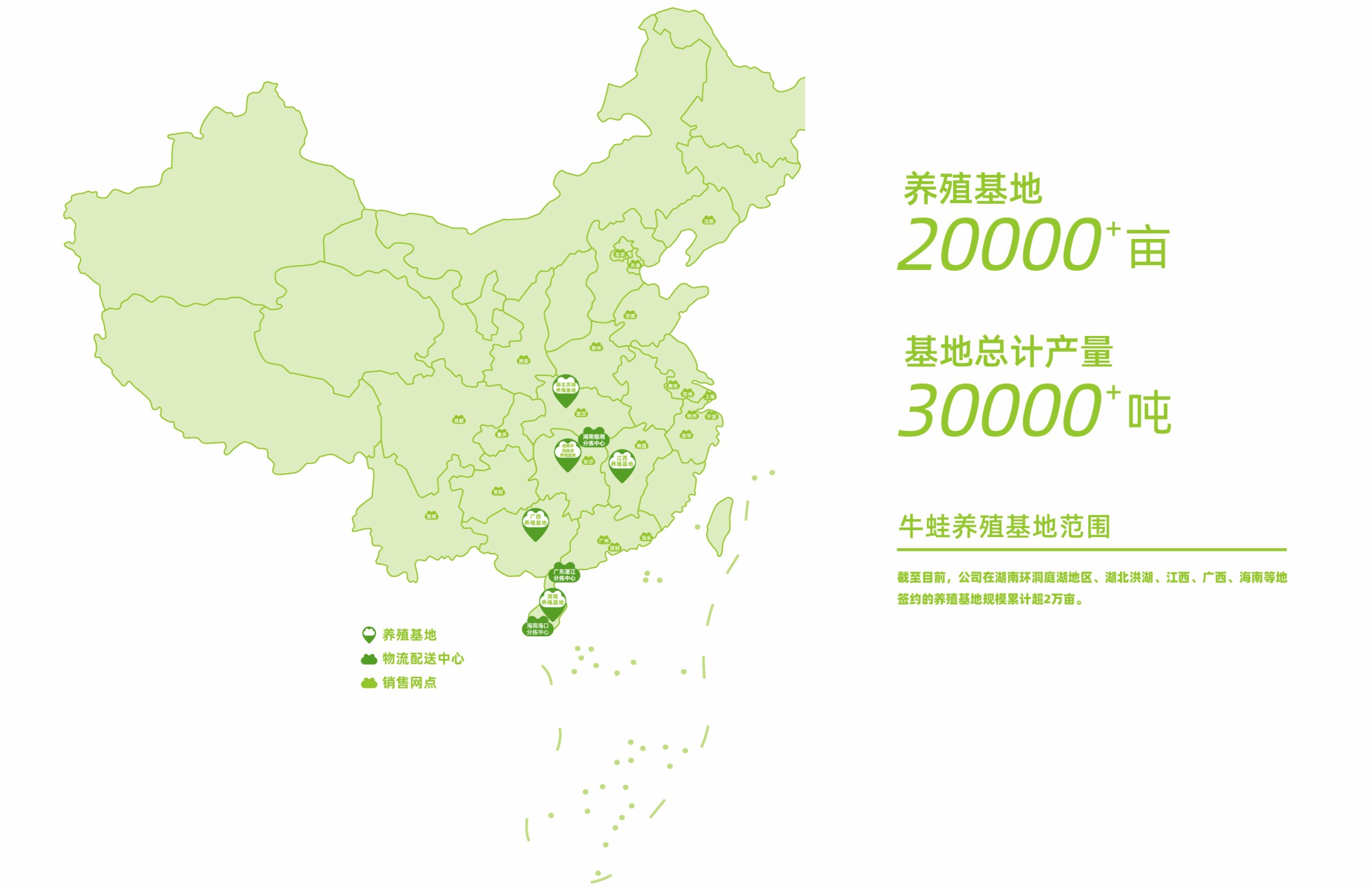 截至目前,公司在湖南环洞庭湖地区、湖北洪湖、江西、广西、海南等地签约的养殖基地规模累计超2万亩,建立了10大养殖基地,拥有国家级水产健康养殖示范场两个,基地总计产量超3万吨。